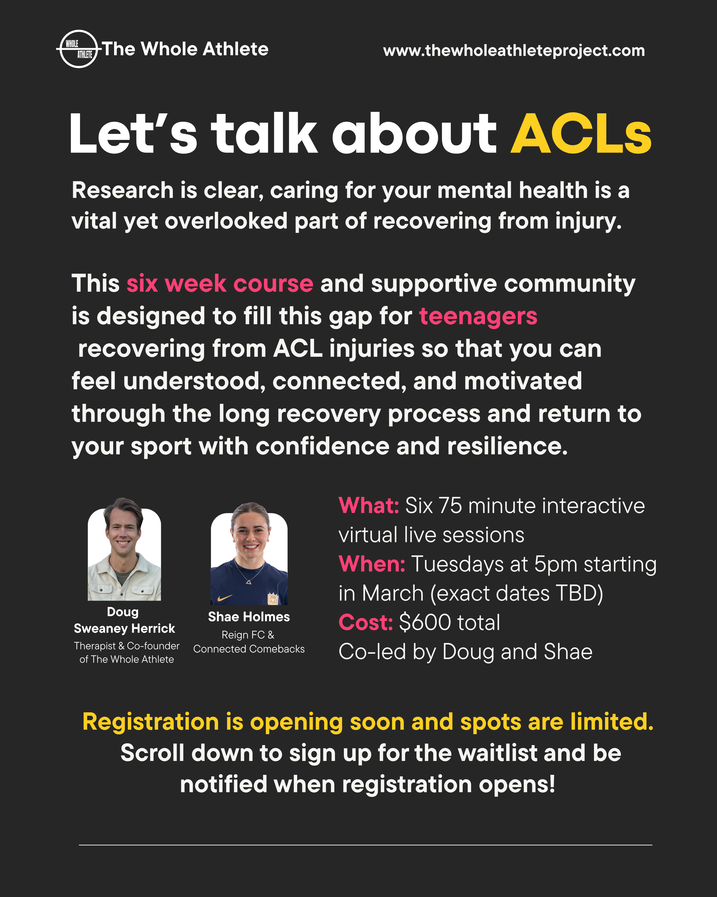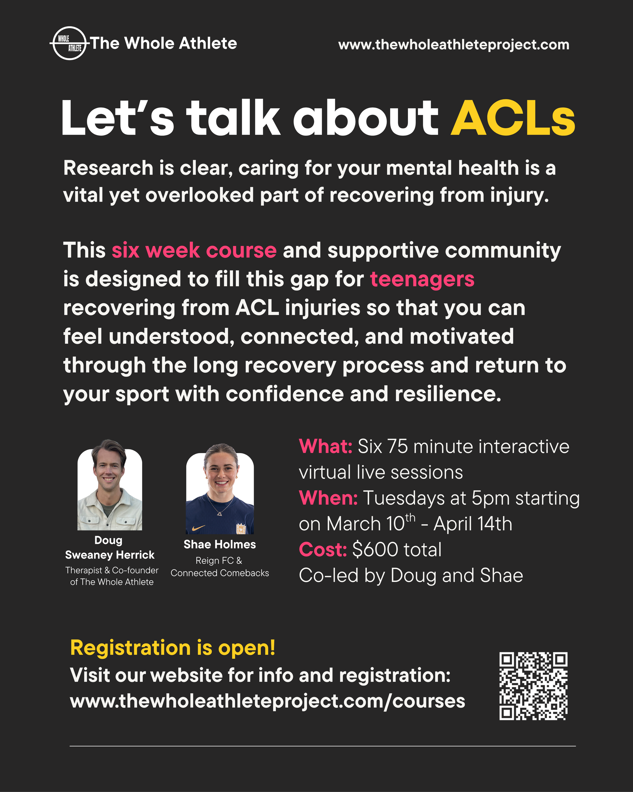 We know just how disruptive ACL injuries can be for teenage athletes. There is the well known physical impacts from the brace to the crutches to the long rehab. But they also mess up your routines, take you away from your teammates and friends, take away lots of your coping mechanisms, interrupt your aspirations and often spark fear and uncertainty. This six week course and supportive community is designed to help you navigate all of these ups and downs so that you can feel understood, connected, and motivated through the long recovery process and return to your sport with a renewed sense of confidence and resilience. We’ve got your back!