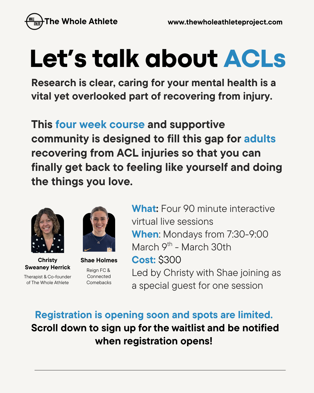 The research is clear, caring for your mental health is a vital part of successfully recovering from injury. This four week course and supportive community is designed to fill this gap for adults who are in the midst of recovering from an ACL injury so that you can return to the things you love! Whether you are a competitive or casual athlete or just tore you ACL or are years out from your injury this course is for you.